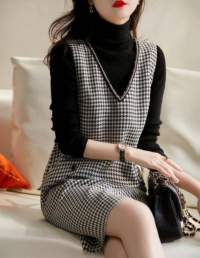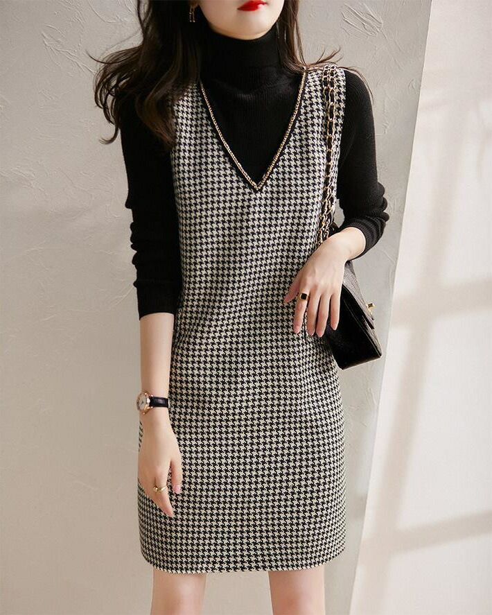 ワンピース 春 秋 レディース 千鳥格 S M L XL