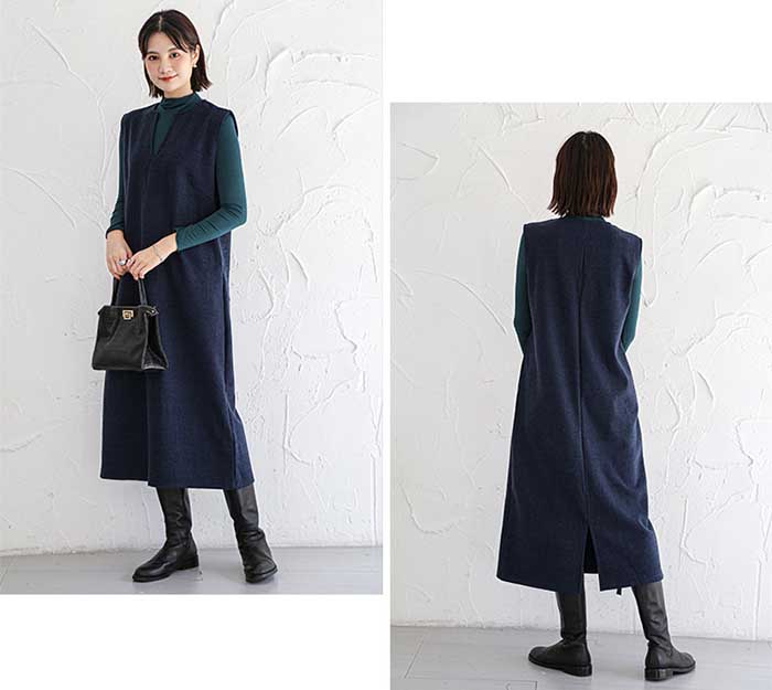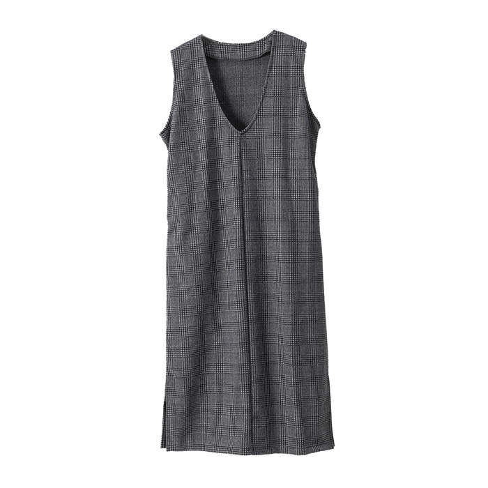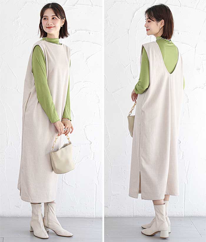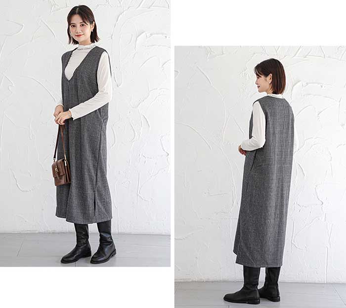 チェック ジャンパースカート 秋 冬 Uネック キーネック 薄いピンク デニムブルー 黒グレー キャメル 紺色