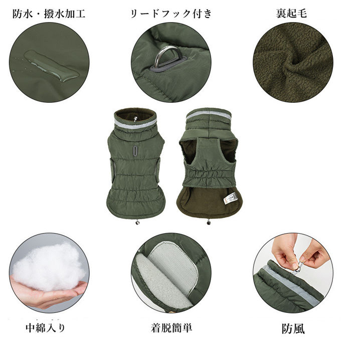 寒い冬にぴったりな暖かドッグウェア!雪や雨に強いポリエステル素材の中綿入りで、裏地にはフリースを使用しているため、しっかりと保温してくれて、ワンちゃんが暖かく過ごせます。