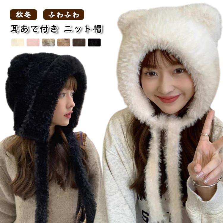 ニットキャップ 耳あて付き 防寒 秋冬用 レディース ふわふわ柔らかい ゆったり大きいサイズ 小顔見え ファー付き 折りたたみ可能 おしゃれ 寒さ対策 耳カバー 紐つき 女の子用 ニット帽