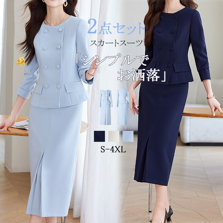スカートスーツ スーツ レディース 春 秋 冬 2セット 洗える タイトスカート ジャケット ポケットなし 長袖 ビジネス タック入り ノーカラー 大きいサイズ セット オフィス タイト 小さいサイズ