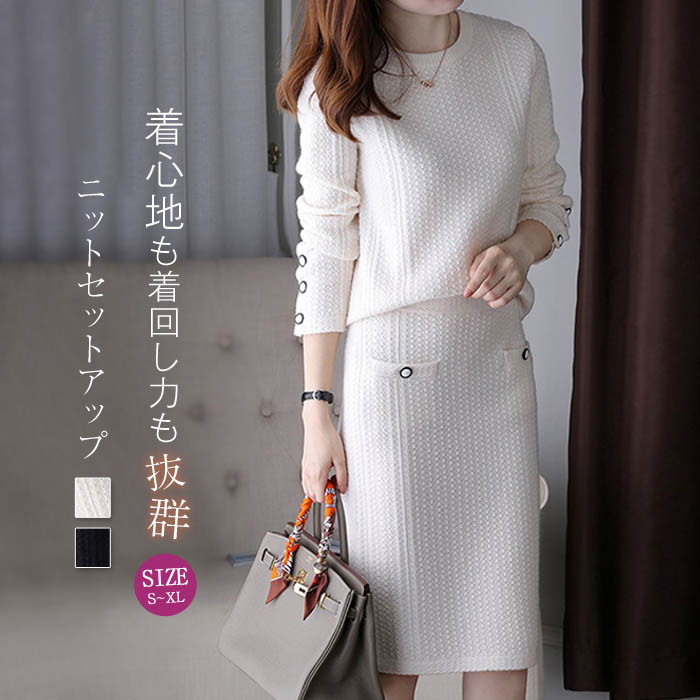 セットアップ レディース 春秋コ―デ ニット ニットセットアップ 上品 長袖 セーター 秋冬 スカートセットアップ 無地 膝丈 オシャレ韓国風 2点セット オフィス 贈り カジュアル