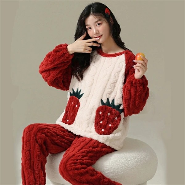 苺柄 もこもこ ルームウェア 上下セット パジャマ 冬 長袖 寝巻き 部屋着 暖かい