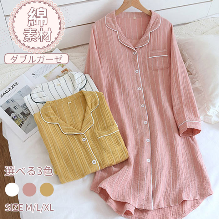 パジャマ ワンピース レディース 春 春用 秋 秋用 冬 ルームウェア ナイトウェア ダブルガーゼ 2重ガーゼ 寝間着 インナー 寝巻き 長袖ワンピース ネグリジェ vネック 長袖 部屋着 マ 襟付き